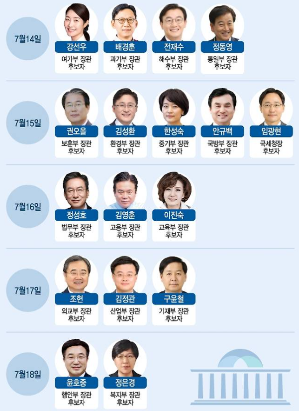 | 7월 15일(화) | 권오을(보훈부), 김성환(환경부), 한성숙(중기부), 안규백(국방부), 임광현(국세청) |